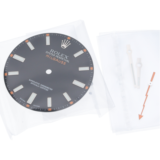 ロレックス、ミルガウス用の文字盤・針セットです。黒文字盤。