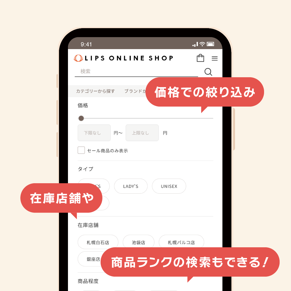 リニューアルにより、新機能『絞り込み検索』が追加されました。キーワード検索はもちろん、「カテゴリ」・「価格帯」・「在庫店舗」・「商品程度」・「ブランド」からご希望の条件でカンタンに絞り込み検索ができるようになりました。